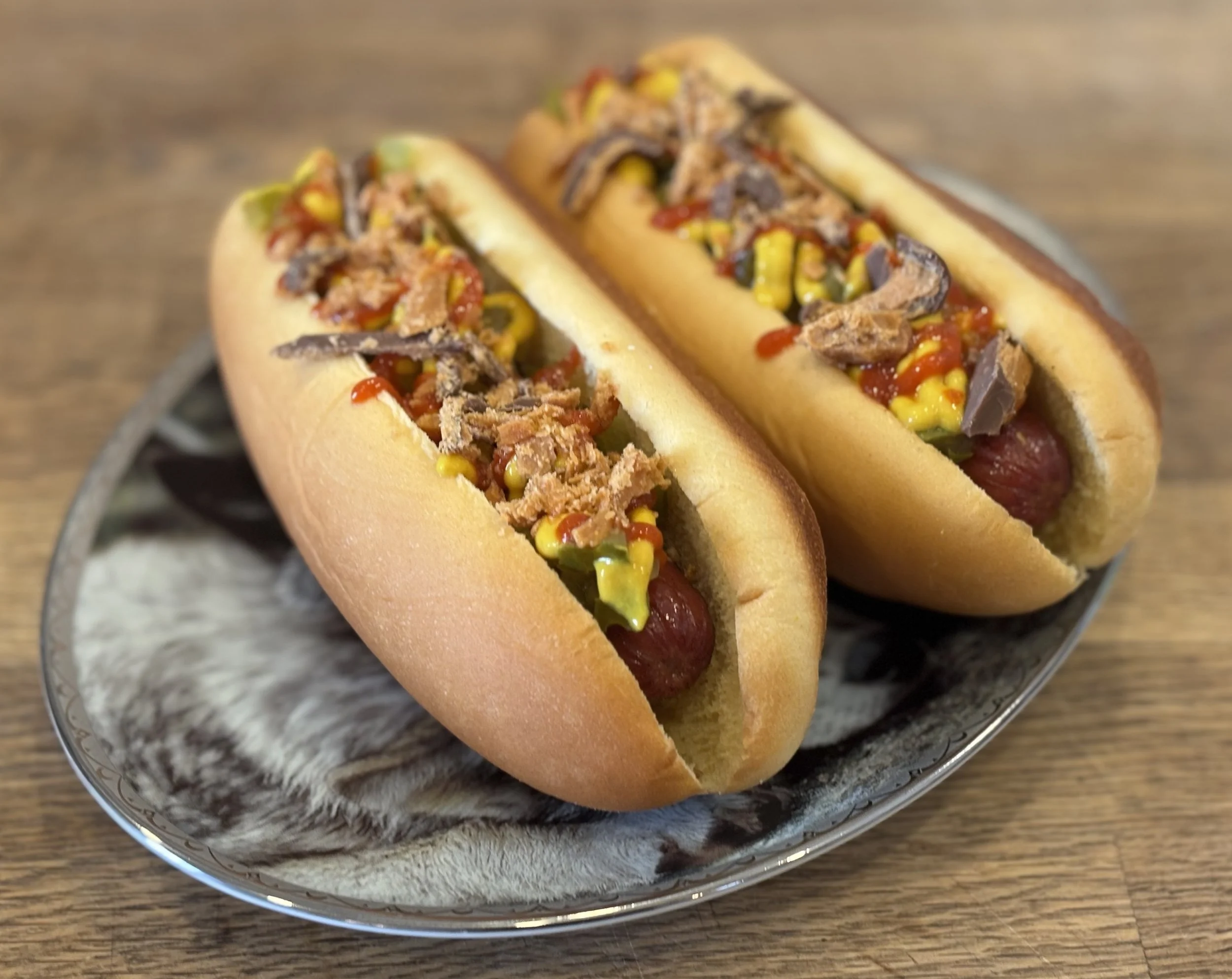 Whoa, whoa, whoa. Don’t have a cow! So this hot dog starts normal, right? Classic bun, regular dog. Then it’s like, ‘Nah, man. Let’s make some bad decisions.’ Sriracha? Boom. Spicy chaos. Yellow mustard? Old-school. Respect. Dill pickles? Crunch city. I’m in. But… chopped Butterfinger?? On a hot dog?? That’s either genius… or something Milhouse would invent. Okay! It’s sweet, it’s spicy, it’s tangy, it’s crunchy…my mouth doesn’t know whether to high-five itself or call a lawyer. This hot dog doesn’t play by the rules. It laughs at the rules. And honestly? If it explodes later, totally worth it.