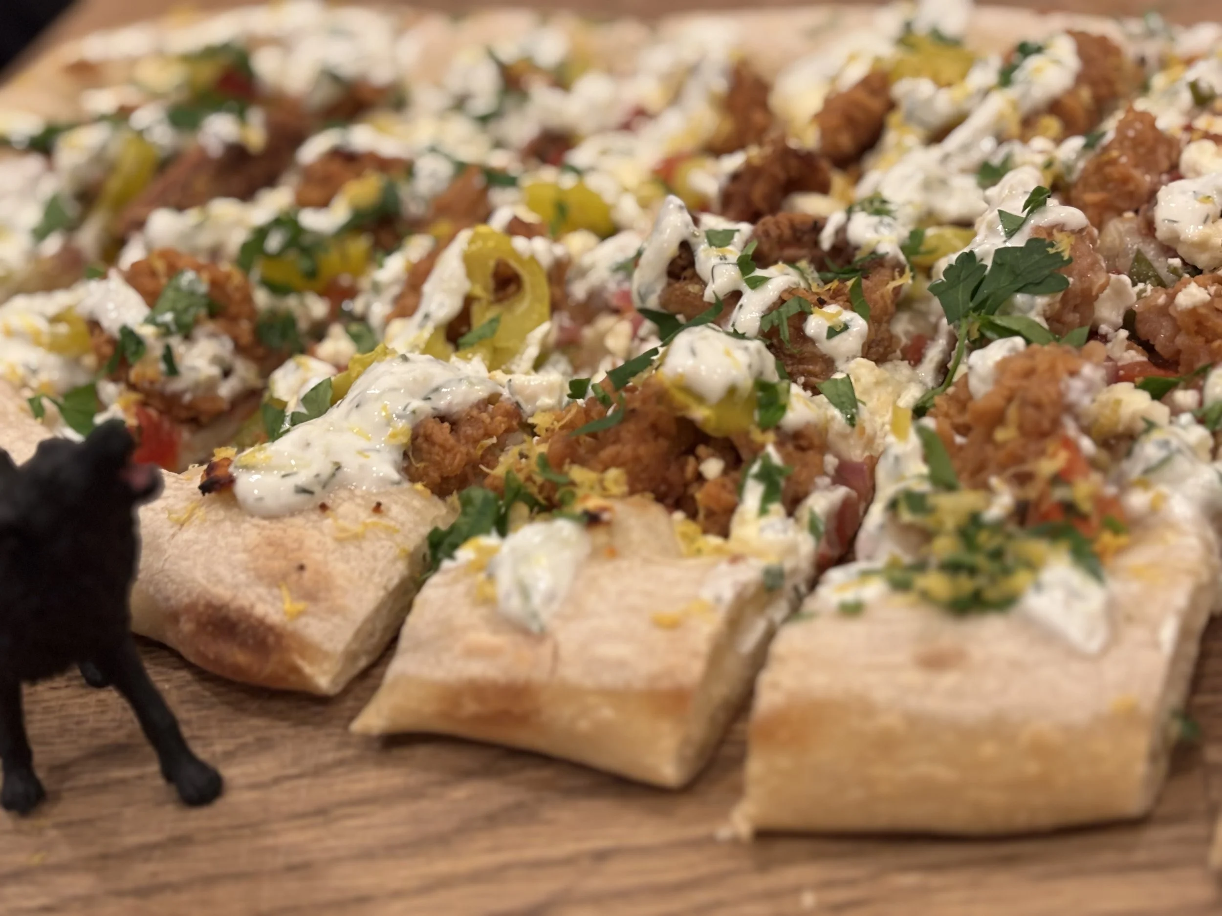 Admiral’s log… we have encountered a most unusual culinary construct. Fluffy dough serves as the vessel, stable, well-formed. Upon it…fried calamari. My people. Yes. Well. War requires difficult alliances. This ‘Greek salsa’…tomatoes, capers, pickled cucumbers, red onion… it is bright, briny, almost oceanic in character. The oregano and garlic lend it strength. Feta cheese..sharp, structured. Pepperoncini…aggressive, but not without purpose. And this tzatziki… cool, calculated. A stabilizing force…Remarkable. The textures are in harmony, crisp, soft, and tender. The flavors…salt, acid, herb, and heat, operate together like a well-coordinated fleet. Though it is… unusual… to consume fried calamari in such a manner… one cannot deny the effectiveness of the composition. We will proceed…And perhaps requisition another.