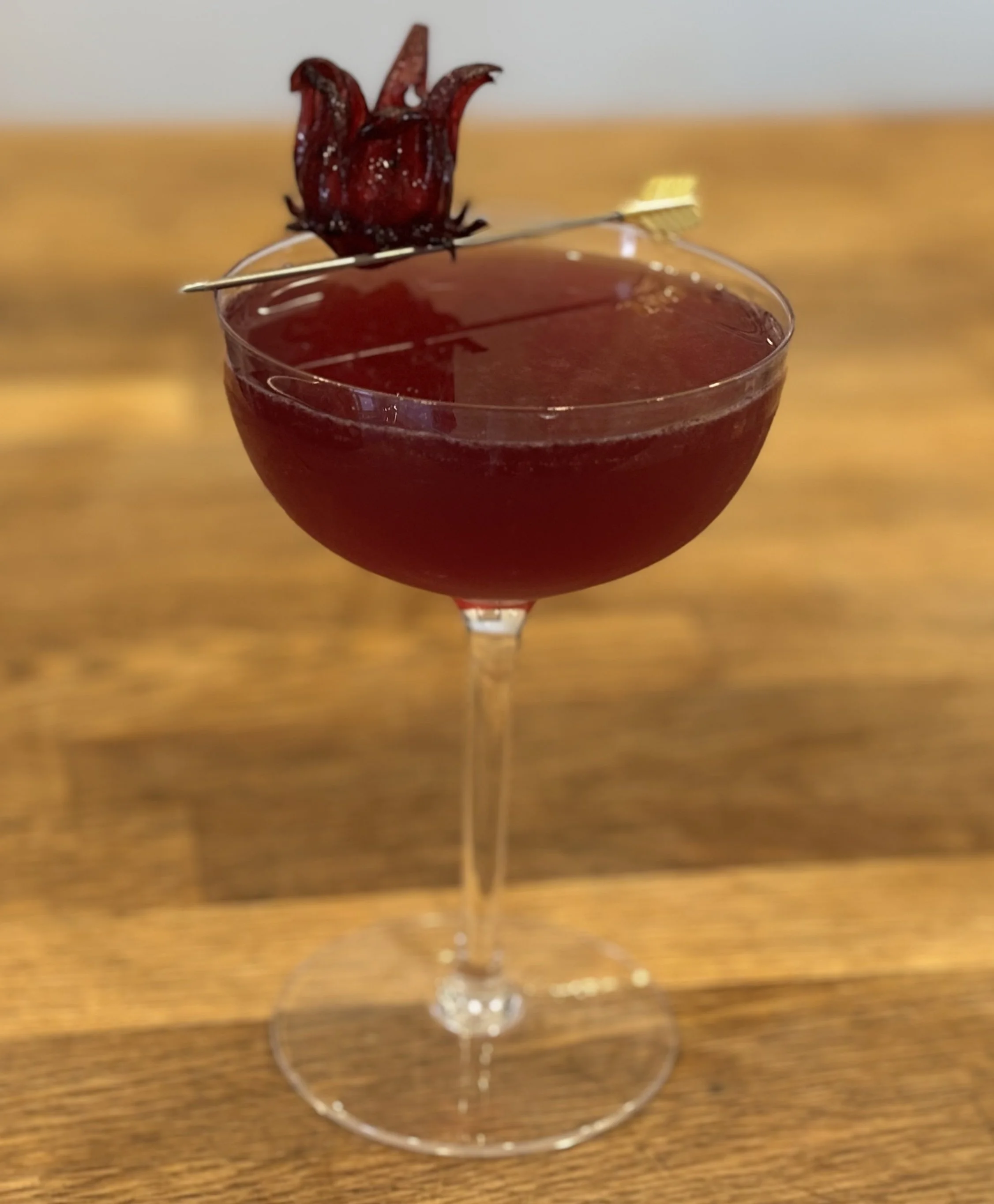 A bubbly botanical floral cocktail with hibiscus, violet, and elder flower.