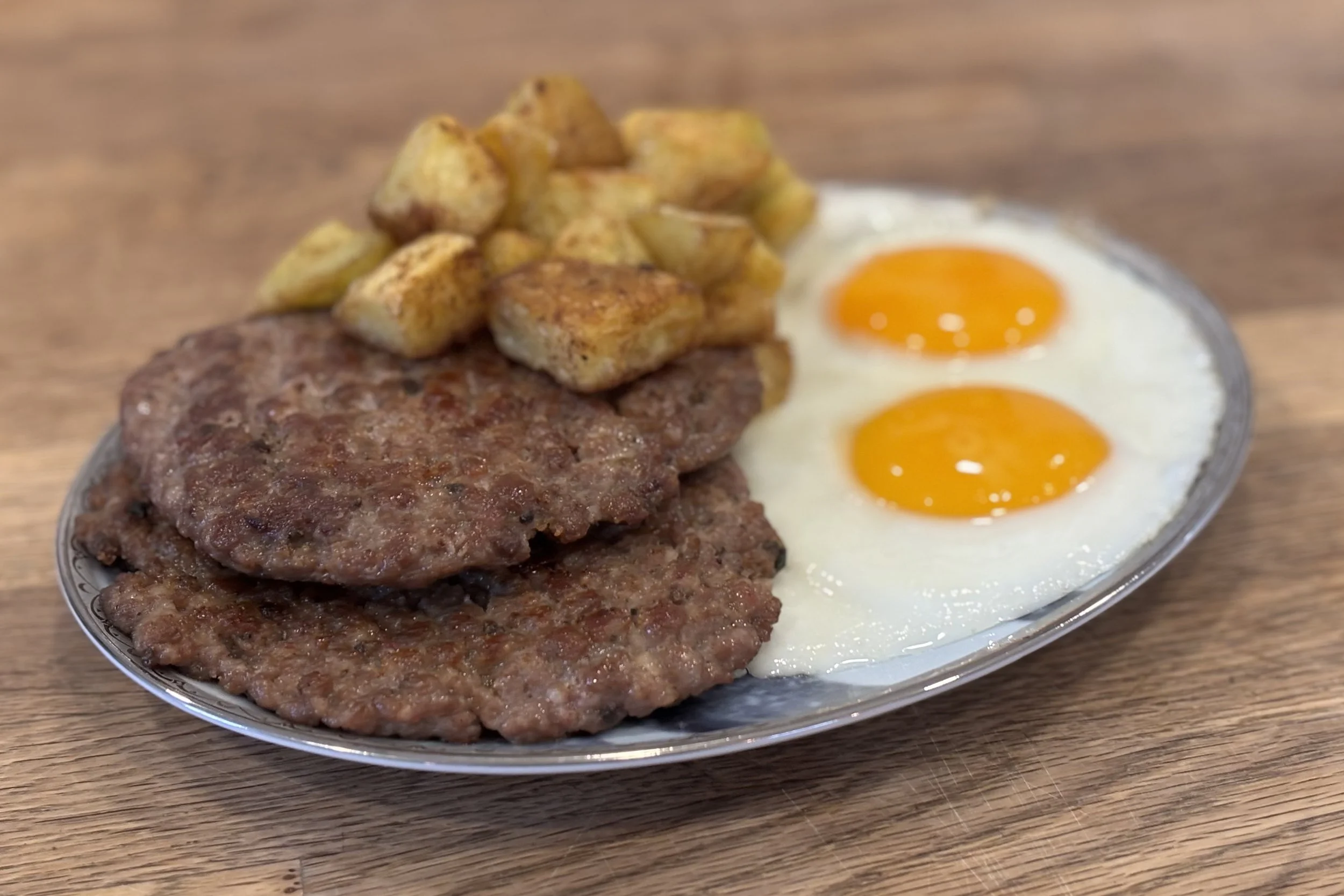So… these are sausages. But they’re flat. Why are they flat? Did someone sit on them? Is that part of the cooking? Whoa. They smell AMAZING. Like… smoky, salty, a little peppery. This is the kind of smell that makes dogs appear out of nowhere. Like magic. And they’re round too. That’s interesting. Humans like circles. Pancakes are circles. Cookies are circles. Now sausage is a circle? Is this a breakfast theme? Oh wow. Okay. Okay, I get it. They’re juicy and savory and a little crispy on the outside! It’s like bacon’s sturdy cousin who wakes up early and has his life together. So… if humans eat these in the morning… does that mean dogs get one too? Because I feel like that’s the rule.