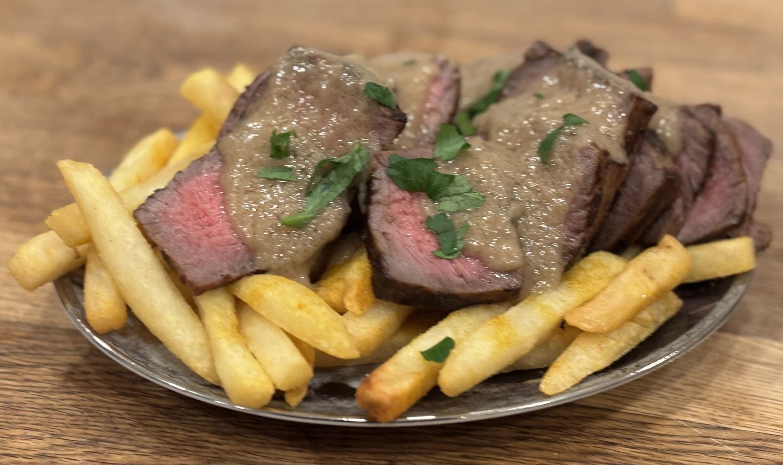 Hmmmm… a cow that has bathed in the sea. Anchovy. Tiny fish. Very bold for something so small. Much like you. Horseradish! It strikes the nose like an unexpected lesson. Pain is flavor leaving the body. Parsley and shallot whisper. Garlic shouts. Green peppercorn dances dangerously. Mustard… mustard challenges destiny. This steak has walked many paths. It has known ocean, earth, and fire. It is confused… yet powerful. To eat it is to accept chaos. To enjoy it is to conquer chaos. Also… tender. I like tender.
