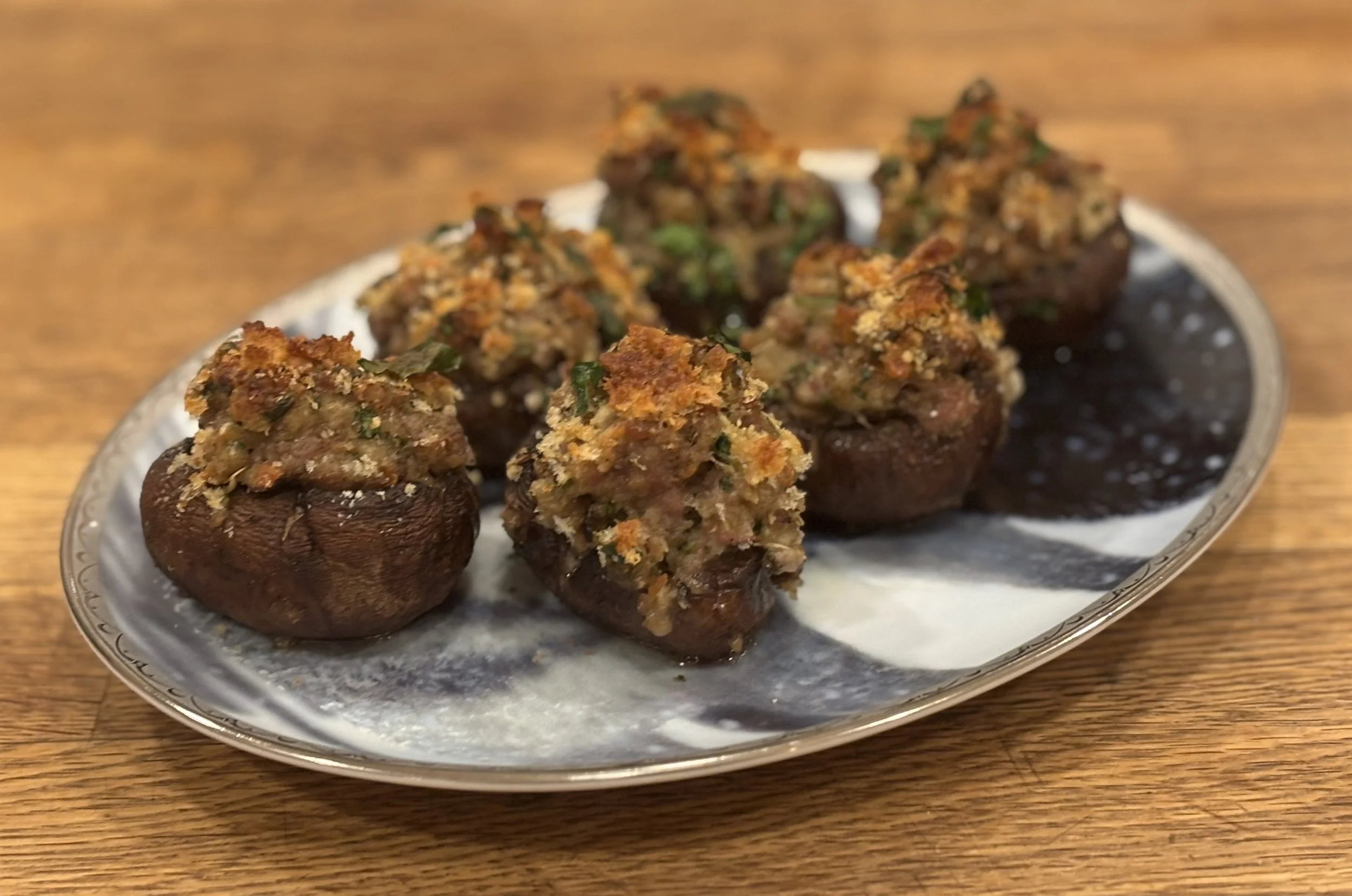 Ahhh… the mushroom stuffed with more mushroom’s destiny. Once, this mushroom grew quietly beneath the earth, dreaming only of rain and shade. Now it is hollowed… filled… transformed. The sausage inside, dense, savory, unapologetically not a mushroom, speaks of another path entirely. One of fire, seasoning, and ambition. Together, they are neither what they were, nor what they seem. Soft cap, rich center. Earth and indulgence entwined. Eat it, and you will feel comfort. Eat too many, and you may question who you were before the plate arrived. Which, of course, is the point.