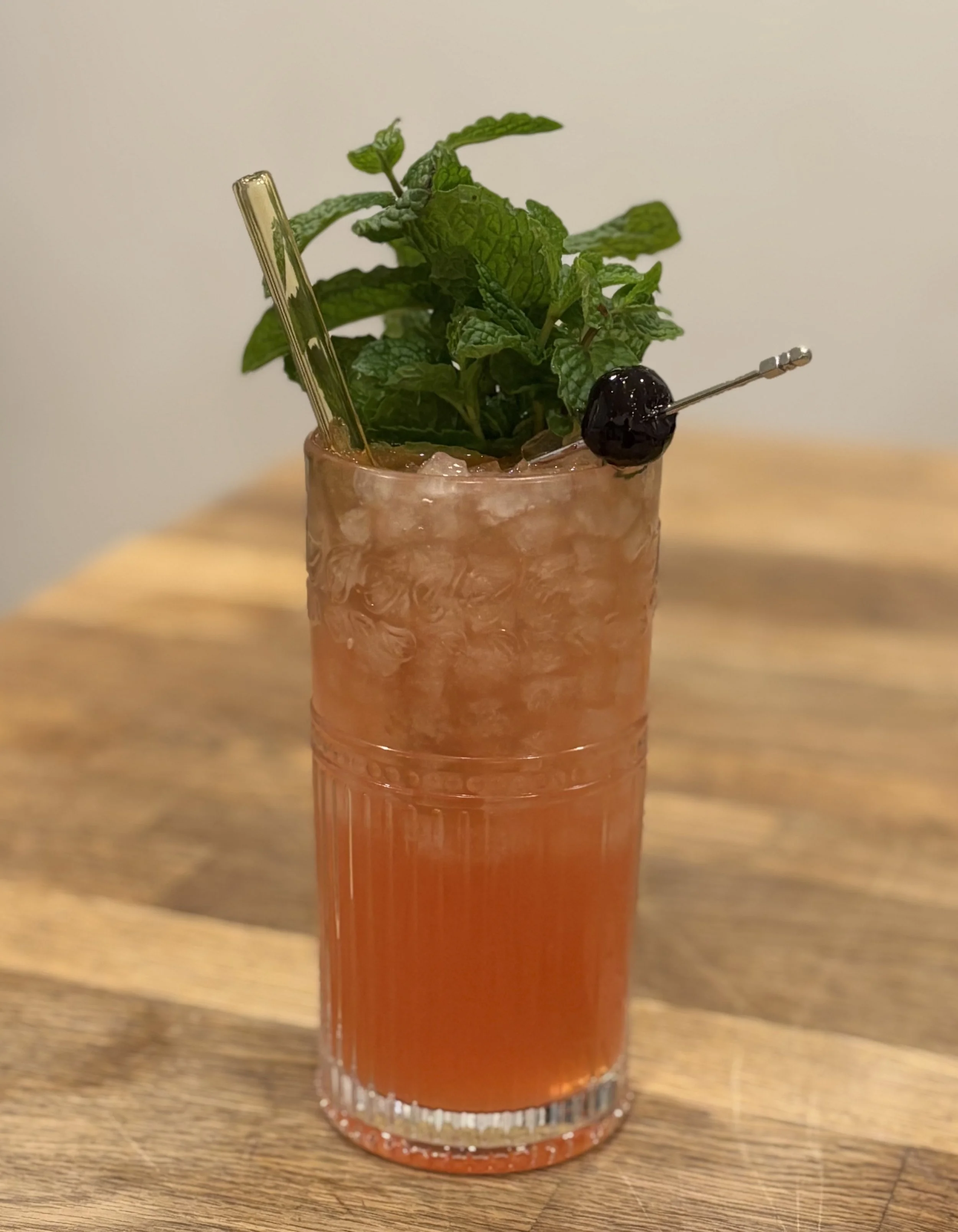 Garnish with mint and cherry.
