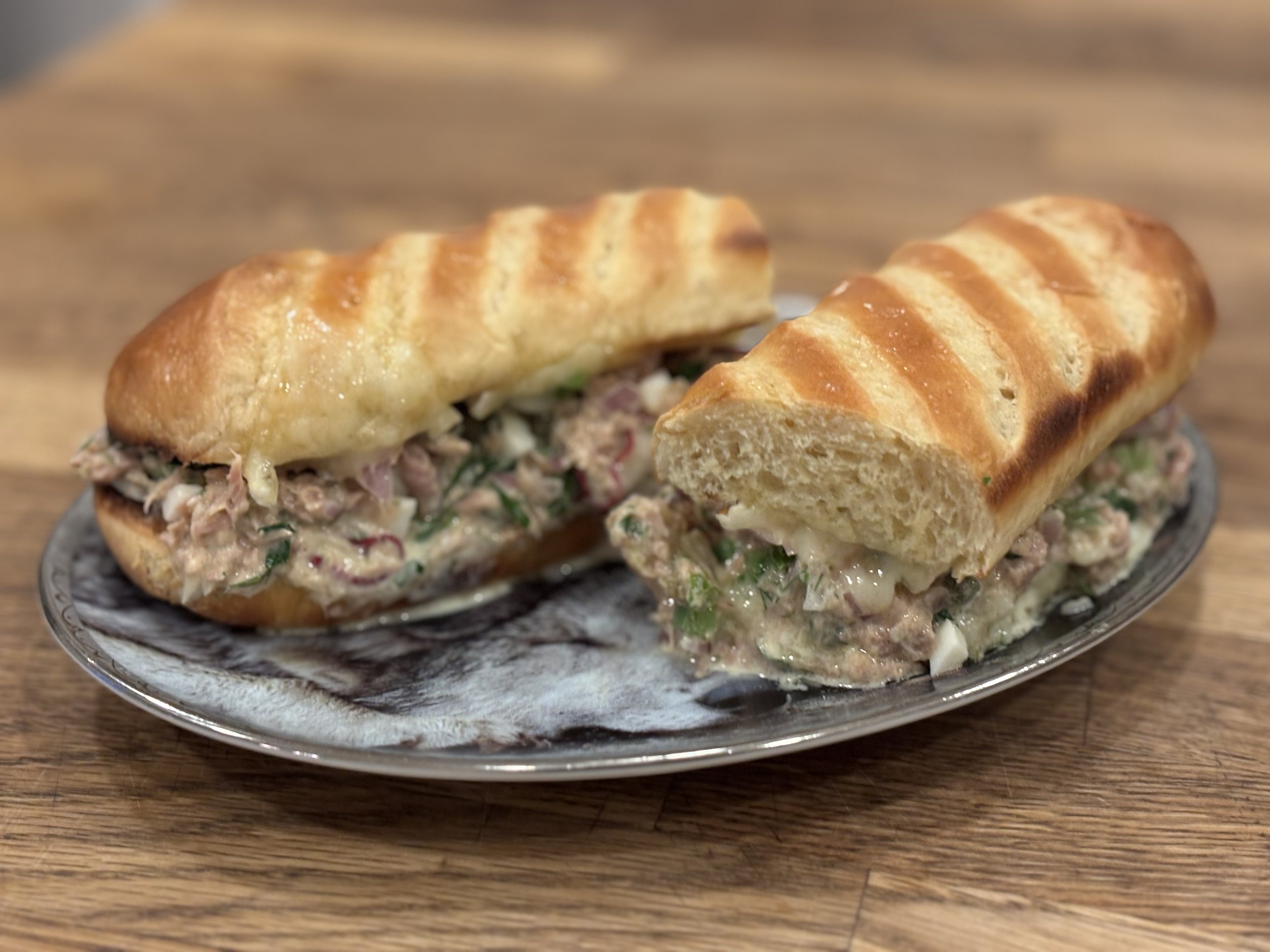 I’m very comfortable with tuna melts. They’re safe. They’re dependable. They don’t… escalate. But this one, this one’s doing a lot. You’ve got fennel in the tuna? That’s… that’s licorice-adjacent. That’s a bold choice. Radish, crunchy, okay. Shallot, classy onion. Capers, tiny salty surprises. And then, wasabi? That’s not a melt anymore, that’s an international incident…Oh. Okay, so the brie is melted, like really melted, and the brioche is buttery and kind of sweet, and then the jalapeño shows up like it has something to prove. And the tuna, it’s…it’s actually really balanced. The fennel isn’t yelling, it’s just…present. The capers pop in like little flavor auditors. The wasabi clears your sinuses like a controlled burn. This is…this is a very well-structured sandwich. It’s like someone diversified a tuna portfolio and it paid off…I’m gonna keep eating this. For research.