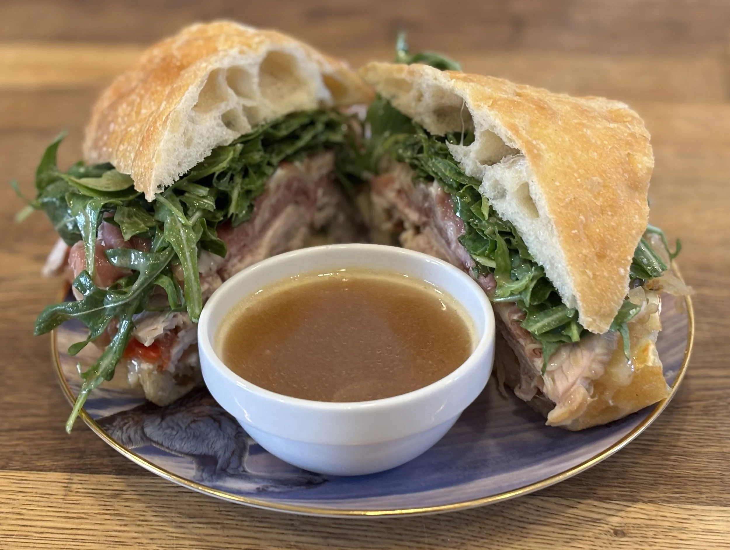Turkey cacciatore, that’s supposed to be hunter’s style, right? Slow-cooked. Tomatoes. Peppers. Garlic. Something that takes its time. You got the brie melting into it… soft, almost too soft. Prosciutto layered in there, salty, thin as paper. Arugula’s sharp. Bitter. Keeps you awake. Back home, we’d eat simple. Beer, shots, whatever was hot. This… this is different. It’s careful. It’s layered. Sweet from the peppers, rich from the cheese, salt from the cured meat. It’s the kind of thing you eat after you’ve been somewhere else. After you’ve seen things. You don’t rush it. You dip it in it’s juices. Let the flavors come one at a time. Yeah. It’s good. Strong. Doesn’t brag. Just does what it’s supposed to do. Solid.
